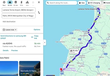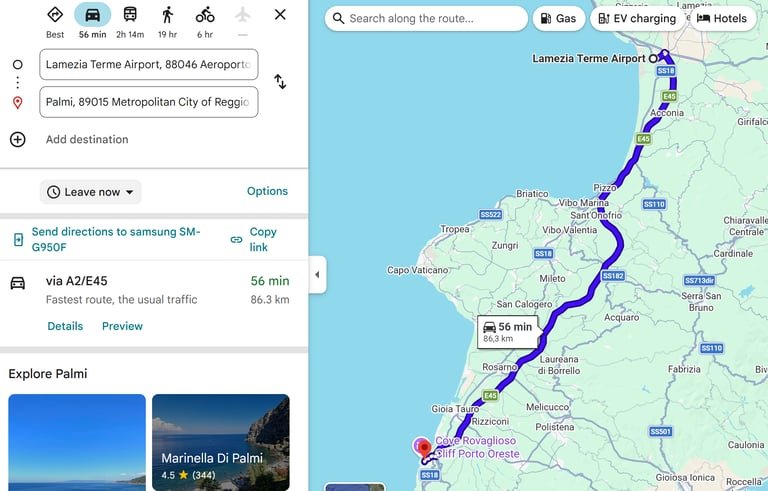 Lamezia Terme International Airport is approximately 86 km from Palmi. It takes about an hour by car